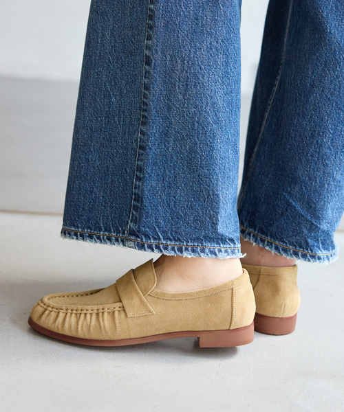 ソフトなギャザーデザインが女性らしく軽やかな印象のレザーローファー。履き始めから柔らかく足に馴染む履き心地が魅力。深めに設定したモカの下にはゴムが内蔵されていてしっかりと足をホールドしてくれます。フラットシューズ感覚でスタイリングに馴染みやすいローファーです。**********************【シューフィッターsaitouコメント】おすすめの足型:足幅細め~普通/どんな足形でもおすすめsaitou普段サイズ:24.5-25cm足特徴:外反母趾、ギリシャ型サイズ感:ぴったりめ着用サイズ:250cm/ホールド感があるので、私はハーフサイズあげてぴったりでした。靴下も着用できるサイズ感です。ギャザーが馴染むので、外反母趾も包み込んでくれて履けました。履き心地:甲高の方や足幅が気になる方はハーフサイズUPがおすすめです。最初に足入れする際は少しフィット感が強めに感じるかもしれませんが、馴染むと自分の足型にちょうどよくフィットします。普段ローファーで馴染み過ぎて踵が抜けてしまう方や、甲が薄い方にも履きやすいデザインです。【スタッフ着用コメント】《スタッフA》普段サイズ:24/着用サイズ:24.5足特徴:足幅普通、甲高めサイズ感:ハーフサイズUPでぴったり履き心地:履き口が狭めだったので1つ上のサイズを試したところぴったりでした。薄手のソックスならこのままのサイズで履けます。包まれるような履き心地で、たくさん歩いても疲れににくかったです。レザーなので馴染めばもっとフィットしてくれそう。***********************カラーにより素材が異なります。 ブラックA 甲材:羊革ベージュ 甲材:牛革ベロア*摩擦や濡れた状態での色移りにご注意ください。*天然皮革を使用した商品の為、商品の仕上がりに個体差が生じます。傷やシワ・色ムラ等につきましても、予めご了承ください。*照明の関係により、実際よりも色味が違って見える場合があります。またパソコン・スマートフォンなどの環境により、若干製品と画像のカラーが異なる場合もございます。*商品の色味は、商品アップ画像をご参照ください。
