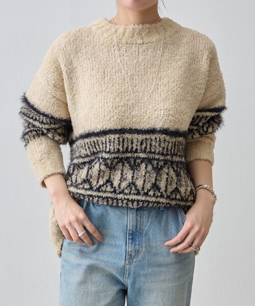 ■アイテム身頃と袖に大きくフェアアイル柄をあしらった、存在感のあるニットプルオーバー。ミックスヤーンを使用し、ふわっとした肌触りと立体的な表情が魅力です。種類の異なる糸を複数撚り合わせているため、奥行きのあるカラーリングに。柄部分には毛足の長い糸を使用し、フェアアイル柄を優しいニュアンスに仕上げました。腰にかかる着丈とゆったりとした身幅・襟元のバランスで、大人の抜け感を演出。冬の装いにぬくもりと華やかさを添える一枚です。■素材・洗濯表示素材:アクリル47% ポリエステル22% 毛18% ナイロン13% 洗濯表示:ドライクリーニング(石油系・弱い処理)※着用時・洗濯時は、必ず取扱い表示・タグをご確認の上、お取り扱い下さい。----------------------------------伸縮性:あり光沢:なし厚み:あつい透け感:なし裏地:なし----------------------------------《お取り扱い上のご注意》・ドライクリーニングしてください。・クリーニングの際は必ずクリーニングネットをご使用ください。・アイロンはスチームで浮かしてかけてください。アイロンは裏から当て布をしてかけてください。・この生地の表面は、引っ掛かりやすくなっています。着用時や着替え時に、バッグ・指輪や周りのものの取り扱いにご注意下さい。・素材の特性上、毛玉や毛羽立ちが発生することがありますのでご注意ください。・タンブル乾燥不可《予約商品について》・サンプルの為、素材情報、洗濯表示については企画段階の情報を記載しております。公的機関での試験データ結果を受け、量産にあたり混率や洗濯方法の変更が発生する場合がございますので、ご了承くださいませ。・サンプルでの撮影、計測をしております。商品の仕様が一部変更になる場合がございます。・撮影サンプル品はブランドタグがついておりません。製品にはタグがつきますので、製品の表に縫い糸が見える場合がございます。・工場の生産の都合上、納期が変更になる場合がございます。検品や輸送の関係で、発送日が前後しますのでご了承ください。また、入荷状況により、お客様への発送が店頭販売より遅れる場合もございます。・店頭に陳列していた商品も含まれる場合がございます。《商品画像について》ご覧頂いている商品の写真につきましては、できるだけ実物の色に近くなるように努めておりますが お使いの環境(モニター、ブラウザ等)の違いにより、色の見え方が実物と若干異なる場合がございます。 予めご了承ください。《ハートをタップして商品のお気に入り登録》【ハートをタップ】登録カラーの商品の「残りわずか」「再入荷」「値下げ」通知を受け取ることができます。【各ショップアプリにてブランドフォロー】 新商品などの入荷情報、最新のニュースやお得な情報を受け取ることができます。