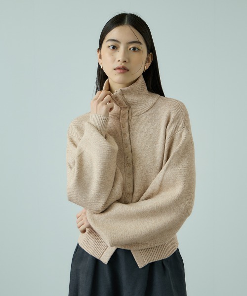 ●POINT表面感のあるもっちりした触り心地のいい風合いミドルゲージのミックス糸を使用しています。スタンドハイネックデザインでもボタンを外してシャツカラー風にもご着用いただけるメニボタンがアクセントになったニットトップスです。裾の広めのリブ切替えがシャープなラインを描き、シンプルながらモード感漂う仕上がりに。衿アレンジでスタイリングに変化をつけられ、ミニマルな着こなしの中にも立体感をプラスします。程よくゆとりを持たせたフォルムなので、リラックスした着心地ながらすっきり見えが叶います。----------------------------------透け感:なし厚さ: やや厚い伸縮性:あり裏地: なしポケット: なし--------------------------------------------------------------------------------------------------洗濯方法家庭洗濯:液温は30℃を限度とし、手洗いができる。自然乾燥:日蔭の平干しがよい。アイロン:底面温度120℃を限度としてアイロン仕上げができる。ドライクリーニング:石油系溶剤による弱いドライクリーニングができる。----------------------------------------------------------------■モデル身長 165cm 着用サイズ M※画像の商品はサンプルとなりますので実際の商品と仕様、加工、サイズが若干異なる場合がございます。※お客様のモニター環境により実際のお色と多少異なる場合がございます。※撮影状況や光の当たり具合により、色合いが異なって見える場合がございます。----------------------------------▼商品のお気に入り登録ハートマークをクリックし、お好きなカラーを選んでお気に入りに登録完売カラーの再入荷通知や、ラスト1点の通知、セールの通知も受け取ることができます。▼ブランドのお気に入り登録新商品や再入荷等、いち早くブランドのお得な情報を受け取ることができます。----------------------------------