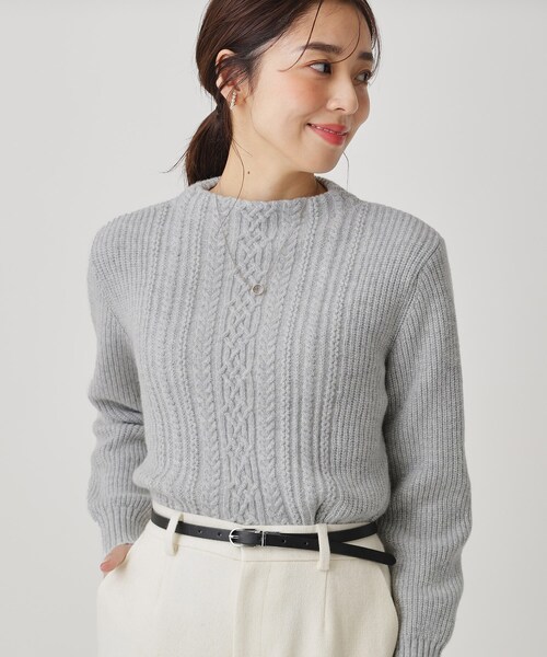 〇デザインポイント 前身にアラン柄を配したニットらしい1枚。 温かさの中にラメがさりげなく煌めきフェミニンな印象です。 モックネックも大人の雰囲気に。無地ボトムスはもちろん、クードシャンスらしくプリントスカートとのコーデもおすすめです。 また、ワイドパンツとのコーデもラメ使いのニットで女性らしいニュアンスに仕上がります。 〇素材ポイント ウールとナイロンのエコ素材に風合いを格上げするカシミヤ5%を加えた紡毛ミドルケージのニットです。 温かみのある糸にラメを巻いて華やかさをプラス、女性らしいニュアンスを持ったニット編地です。 ※照明の関係により、実際よりも色味が違って見える場合があります。また、パソコン・スマートフォンなどの環境により、若干製品と画像のカラーが異なる場合もございます。 モデル情報:身長166cm 着用サイズ:38(M) 店舗へのお問い合わせ商品番号:187-14135 ●製品寸法: 34(SS):着丈51cm B88cm 袖丈51cm 肩幅36cm 38(M):着丈53cm B94cm 袖丈53cm 肩幅38cm 備考: