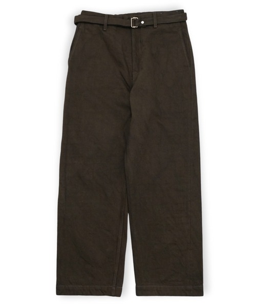 YOKO SAKAMOTO ユニセックスブランドとして展開。 ブランドコンセプトはシーズン毎に敢えて設けず、「日常着」として常に身につけたくなるプロダクトを提案。また、女性デザイナーが作り出すメンズウェアという独自の空気感にもこだわったモノづくりを行っている。 ------------------------------------------------------ YS定番のデニムに、天然染めを施したスペシャルなシリーズ。 京都の歴史ある染め工場にて、熟練の職人が一点一点手染めでガーメントダイを施したスペシャルシリーズ。 着用を重ねる度、唯一無二な経年変化がお楽しみ頂けます。 KAKISHIBU : 柿渋 後身頃ウエストゴム仕様のベルト付きワークトラウザー。 リラックス感のある、ワイドなストレートシルエットが特徴。 共生地で製作したロングベルトがセットで付いたユニークなルックス。 タックボタンは鉄製の無塗装。徐々に錆びて行く為、独特な風合いとルックスに育ちます。 天然染めらしい唯一無二の経年変化が楽しめ、着用を 重ね洗い込む度に、自分だけの一着に育ちます。