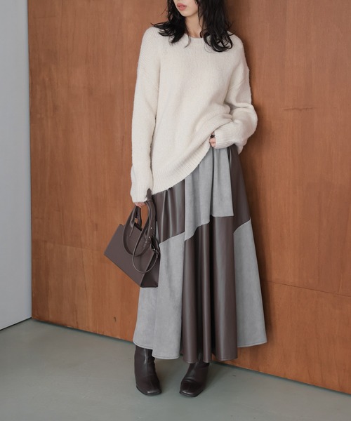 スエード×レザー 異素材ドッキングフレアスカート フェイクスエードの柔らかな風合いと、 フェイクレザーの艶やかな光沢が絶妙に融合した、 モード感あふれるフレアスカート。 Point 01 裾に向かって優雅に広がる フレアシルエットは、歩くたびに軽やかに揺れ、 女性らしいエレガントな雰囲気を自然と演出。 Point 02 秋冬のムードを盛り上げる スエード×レザーのコンビネーションは、シーズン感たっぷり。 フェイクレザーの程よい光沢が上品さをプラスし、 フェイクスエードのなめらかな肌触りは着るたびに 心地よさを実感。 【25AW】 ■Fabric 程よく上品な光沢感のあるフェイクレザー素材と、 柔らかくなめらかな肌触りのフェイクスエード素材を使用。 --------------------- 透け感:なし 裏地:なし 厚さ:普通 伸縮性:あり --------------------- ▼《お気に入り登録》でお得な情報がいっぱい▼ ・「商品のお気に入り登録」で再入荷通知や、ラストの通知、セール通知も受け取ることができます。 ・「ブランドのお気に入り登録」で新商品や再入荷など、お得な情報を受け取ることができます!
