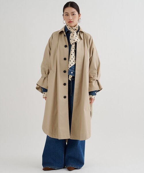 【2026SS】気分やシーンに合わせて雰囲気の変化を楽しめるトレンチコート■本格トレンチ素材を使用したポンチョコート。■加工を施すことで、上品なハリ感と実用性を兼ね備えた一枚。■気分やシーンに合わせて何通りにも着こなせる万能デザインがポイント。■袖口の紐をボタンで留めればフリルのような立体的な表情に。■袖口を折り返せばゆったりとしたポンチョシルエットに。■ウエストはベルトを締めることでメリハリが生まれ、モード感のあるスタイルに。■さらにガンパッチを備えることで風の侵入を防ぎ、トレンチらしい機能美もプラス。■汎用性と品の良さを両立した、着こなしの幅が広がる大人の優秀アウター。【COLOR】ベージュ:オンオフ問わずに着こなしやすい定番のベージュ。ネイビー:スタイリッシュな印象を叶える上品なネイビー。【MATERIAL】シャリ感のあるタッチが特徴の高密度に打ち込んだトレンチ素材。撥水加工を施すことで機能性と張り感を出した素材。※撥水加工を施しておりますが、完全な防水ではございませんのでご注意ください。【STAFF COMMENT】■身長156cm|普段サイズ M~L|着用サイズ F裾のラウンド感がオシャレ。着るだけでサマになる一枚。オーバーサイズなシルエットが素敵なアウターです。■身長167cm|普段サイズ M~L|着用サイズ F袖口やウエストのベルトでシルエットを変えられるので、様々なコーデに合わせやすいです。裾のスリットのおかげで広がり過ぎずスッキリ着られます。----------------------------------------------------洗濯方法:ドライクリーニング透け感:なし裏地:あり伸縮性:なし光沢感:なし----------------------------------------------------【注意事項】・画像の商品はサンプルです。実際の商品と仕様、加工が若干異なる場合があります。また 、パソコンやスマートフォンのモニター環境などにより、色味が違って見える場合があります。・店頭及び屋外での撮影画像は、光の当たり具合で色味が違って見える場合があります。商品の色味は、スタジオ撮影の画像をご参照ください。・入荷状況により、お届け予定が前後する場合があります。・お客様への発送が店頭販売より遅れる場合があります。・追加生産商品は、一部の店舗、通販で販売中の場合があります。予めご了承下さい。【気になるアイテムは、「お気に入り」登録を】ハートマークをクリックしておくことで、スムーズにお買い物が楽しめます。・ラスト一点のお知らせ・再入荷のお知らせ・SALEのご案内