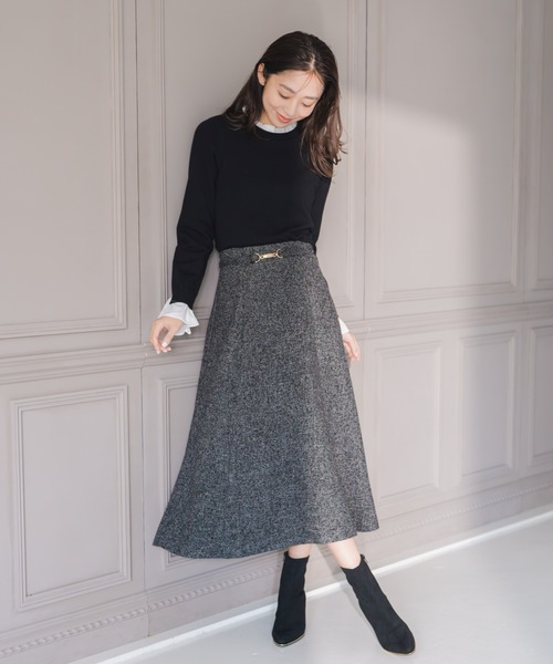 2025 Autumn&Winter Itemクラシカルムード漂うビット付きフレアスカート【 design 】今季はベルトをビット付きデザインにアップデート。ウエストから裾にかけて、タックやギャザーを入れずにヒップラインに沿って広がる美しいフレアシルエットに仕上げました。取り外し可能なベルトの後ろにはゴムを内蔵し、見た目の上品さと着心地の良さを両立。クラシカルなビット金具の艶感が、大人の品を感じる綺麗めな印象を演出します。※BL/WHのみ、表情のあるゴマツイード素材を使用しています。【 styling point 】トップスをインしてウエストのビットデザインを見せると、スタイルアップ効果が高く、上品な着こなしに。ニットやブラウスなど幅広いアイテムと合わせやすく、オン・オフどちらでも活躍する万能スカートです。★《お気に入り登録》でお得な情報をGET★・「商品のお気に入り登録」で再入荷通知やラスト1の通知、セールやクーポンの通知も受け取ることができます!→ハートマークをクリック・「ブランドのお気に入り登録」で新商品や再入荷など、お得な情報を受け取ることができます!