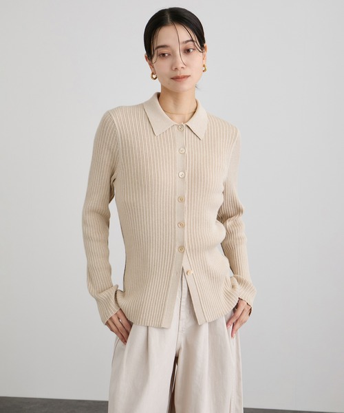 大きめの衿と配色ラインが目を惹くカシミヤ混カーディガン。上品なフィット感で、羽織りにもトップスにも活躍する着回し自在な一枚。■デザイン/シルエット大きめの衿が印象的なポロシャツデザインのニットカーディガン。程よくフィットする美シルエットで、すっきりと上品に見せてくれます。サイドの配色ラインがアクセントとなり、シンプルながら洗練された印象に。■素材コットンにカシミヤをブレンドした、柔らかく滑らかな肌ざわりの上質ニット。ランダムリブの立体感がありながら軽やかなハイゲージ仕立てで、秋冬から春先まで快適に着られる万能素材です。■コーディネートカーディガンとして羽織るのはもちろん、ボタンを留めてプルオーバー風にも着用可能。オンオフ問わず使え、1枚でコーデが決まる優秀ニットです。■コットンシルクカシミヤシリーズ一覧・商品番号:SHK35820 商品名:コットンシルクカシミアリブポロCD・商品番号:SHM35820 商品名:コットンシルクカシミヤ2WAYジレPO■モデル身長:166cm 着用サイズ:F-----------------------------裏地:なし光沢感:なし透け感:なしポケット:なし伸縮性:あり生地の厚さ:薄手-----------------------------
