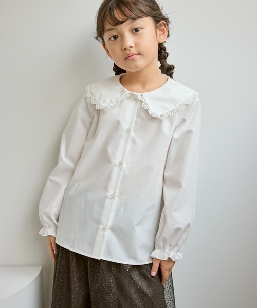 卒園式・入学式などのセレモニースタイルに。特別な日のおめかしビッグカラーブラウス。【素材感】・少しハリ感のある綿タッチの素材感。【デザイン・シルエット】・大きい衿がポイントのセレモニーにもおすすめのブラウス。・衿端にはレースをあしらっていて、価値感のあるデザインに仕上げている。・後ろから見ても襟がしっかりと見えるデザインで、360度どこから見ても可愛いスタイルが完成。・袖口はフリルのようになったキャンディスリーブ風のデザイン。【カラー】・セレモニーにマストのホワイト1色のみ。【スタイリングポイント】・襟のデザインが最大限に活かされる、ジャンパースカートやボレロのインナーにおすすめ。・シンプルなフレアスカートやプリーツスカートと合わせるだけで、ピアノの発表会やお食事会など、きちんとした場面に対応できる上品なスタイリングに。-----------------------------裏地:なし光沢感:なし透け感:ややあり伸縮性:なしボタン:あり(開閉可)生地の厚さ:普通その他仕様:袖口はゴム季節:春、秋、冬-----------------------------※撮影時の光、お使いのモニター環境によって色の見え方が違う場合がございます。