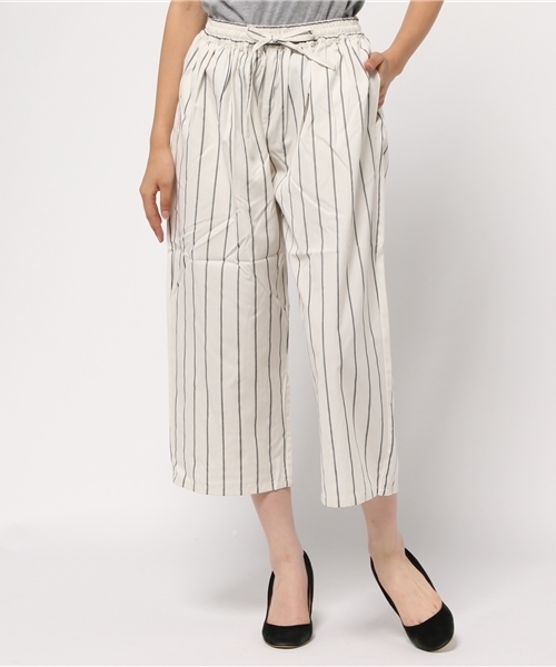 ストライプガウチョパンツ布帛素材です。エフォートレスなウエストゴムのリラックしたパンツ。シンプルなトップスとヒールを合わせて少しきれい目が今年らしいコーディネートです。