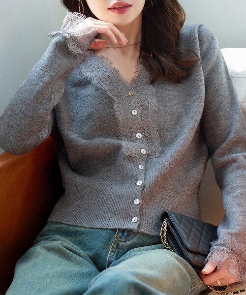 繊細なレースが上品な華やかさを添えるVネックニットカーディガン。首元と袖口のレースが女性らしいやさしさを引き立て、シンプルな中にも洗練された大人の印象をプラスします。ほどよい厚みのニットが季節の変わり目にも活躍し、オフィスにもお出かけにも使いやすい上品フェミニンなアイテムです。【素材・サイズ感】ほどよくゆとりのあるサイズ感で、女性らしいラインをきれいに見せてくれます。軽やかで動きやすく、窮屈感のない着心地で長時間の着用も快適。コンパクトな丈感がボトムとのバランスを取りやすく、スタイルアップも叶います。さらりと羽織るだけでコーデがまとまり、毎日の着こなしに自然と馴染む一枚です。【STAFFコメント】高見えレースが大人かわいい長袖ニットカーディガン。無地ニットにレースの異素材ドッキングが1枚で着映えするデザインです。着用するだけで品のあるきれいめスタイルになるので、オフィスカジュアルにも◎程よいコンパクトサイズと短丈で着痩せするのも嬉しいポイント♪春秋冬とロングシーズン着回しできるレースカーディガンです。《KOBE LETTUCE ー神戸レタスー》 プチプラレディースファッションからコスメまで、トレンドアイテムを豊富に取り揃えております。 毎シーズン発売されるインフルエンサーとのコラボ商品はSNSでも話題に。