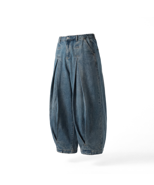 Long Tuck Wing Balloon Denim Pants - Washed Blue