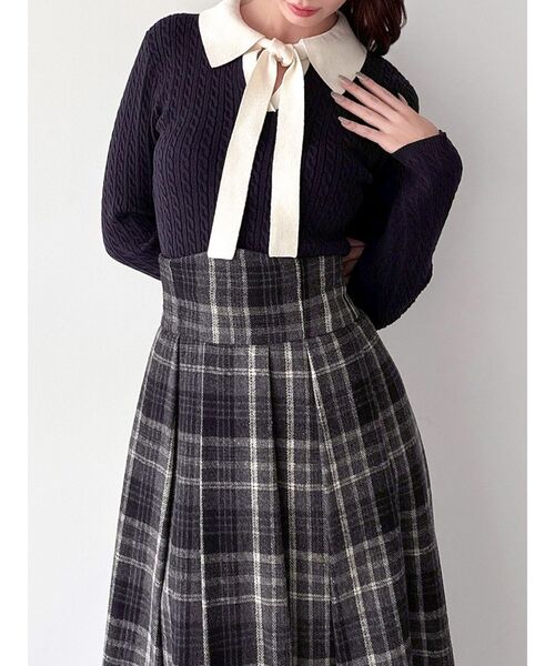 トレンド感満載のニットトップス▽デザイン▽トレンド感のあるタイトシルエットのニットトップス。開いた襟が首周りを華奢に見せ、女性らしい雰囲気を演出します。胸元のリボンタイは取り外し可能◎▽カラー▽白、グレー、ネイビーの3色展開。▽スタイリング▽デニムを合わせたカジュアルなスタイリングはもちろんミニスカートやフレアスカートを合わせたフェミニンなコーディネートもおすすめ◎どんなボトムスにも合わせやすい万能アイテムです。
