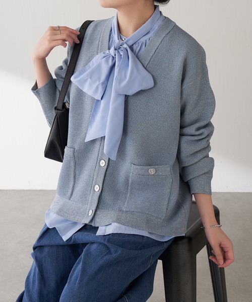 シンプルながら人と被らないこだわりカーディガン※WEB限定カラー:ネイビー【POINT】・軸となる太い糸と細い微ツヤの糸をメランジ調にしており奥行きのあるカラーリングが叶います。・シェル風のボディ×メタルの淵のボタンがワンポイントとなり、シンプルすぎないデザインです。・ポケット口のボタンはデザインとして付けているので物は入れやすい仕様にしています。・ほっこりはしすぎないですが、程よい厚みがあるので長いシーズン着ていただけます◎・腰回りをカバーできる丈感も嬉しいポイントです。【おすすめコーディネート】フレアスカートでもストレートパンツ、ワンピースともバランス良く決まる丈感です。ブルー:デニムっぽいカラーリングで大人カジュアルがお好きな方にぴったりです。【おすすめのスタイリングアイテム】・ラメスクエアロンT CLZ1052406A0003・サテンマーメドスカート CLS5052301A0001・2WAYボウタイシャツ CLZ1061104A0002・チャームタックパンツ CLQ5061103A0001・サイドラメダンボールタイトスカート CLZ1061101A0002【素材】ポリエステル80%、レーヨン20%透け感:なし裏地:なし伸縮性:あり光沢感:なしおすすめ着用時期:秋、冬、春洗濯:手洗い可≪返品・交換について≫・着用後、洗濯後の返品・交換は致しかねます。・商品到着後、着用前に商品状態のご確認をお願い致します。・ECサイトでご購入いただいた商品は、お修理を承っておりません。【気になる商品は「お気に入り」登録を】ハートマークをクリックし、お好きなカラーを選んでお気に入りに登録すると入荷情報や残り1点の通知、完売カラーの再入荷、セール情報などを受け取ることができます。※撮影場所やお使いのモニター環境により若干お色味が異なる場合がございます。特にロケの撮影では明るく見える傾向にございます。詳細撮影画像で色味をお確かめくださいます様お願いいたします。※サンプルで撮影をしております。若干の仕様が変更になる場合がございますので予めご了承の上ご注文くださいますようお願いいたします。※サンプルでの採寸のためあくまで目安となります。予めご了承ください。