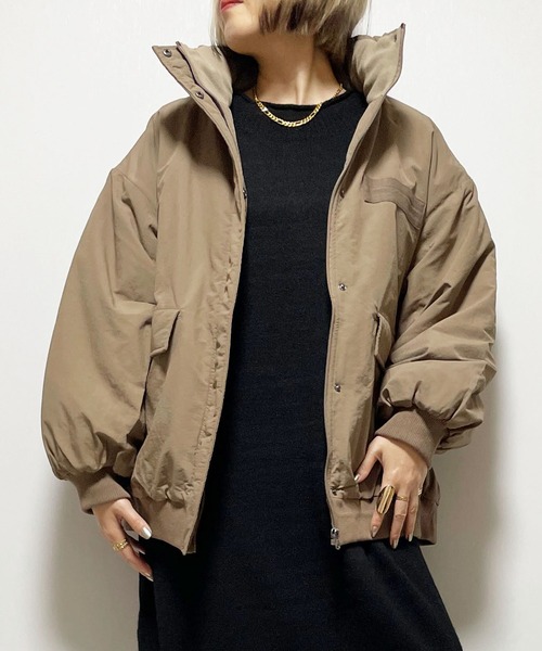 ◆ボリューミーな中綿入りブルゾン◆【ディテール】ハイネックデザインがトレンド感のある中綿入りブルゾン。襟裏はフリース素材になっており優しい肌触りです。フラップポケットや胸元のテープがミリタリーライクでかわいい一着。ボリュームのあるシルエットが抜け感たっぷりです。フロントジップで着脱しやすくさっと羽織れるのも魅力。【素材】(表地)ナイロン100%(中綿)ポリエステル100%(裏地)ポリエステル100%(リブ)ポリエステル97%、ポリウレタン3%(フリース)ポリエステル100%