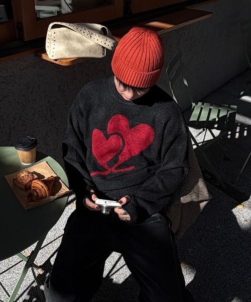■デザイン 表面を起毛加工し、毛先が細くなるようにカットする「シャギーカット」を施したニットで、毛足が長くふわふわとした質感と、暖かみのある見た目が特徴のハートシャギーニット。ハート部分は若干の立体感があるので、ニット特有のモッタリ感を防ぎつつインナーとしても奥行きを出してくれます。サムホール付なので手元まで暖かく、アウターの袖から出すスタイリングもお勧め。ブラック地にレッドのハート、ダークグレー地にライトグレーのハートで男女共に着やすい2カラー展開。オソロにもお勧めなヘビロテニットになります。 ■素材 ポリエステル78% ナイロン12% 毛8% ポリウレタン2% ■推奨サイズ サイズ1 : ~170㎝ サイズ2 : 171cm〜 ◾️商品特性上のご注意 ・素材の特性上、摩擦により毛羽立ちや毛玉(ピリング)が生じる場合があります。 毛羽立ちはブラシで軽く整え、毛玉を取り除く際は引っ張らず小ハサミなどで取り除いてください。 ・引っ掛かりには充分ご注意ください。 ・洗濯の際ネットを使用してください。 ・中性洗剤を使用してください。 ・漂白剤及び蛍光増白剤入りの洗剤の使用はお避けください。 ・濡れたまま放置すると色落ちする場合がありますので、直ちに形を整えて干してください。 ・着用や洗濯を繰り返す事で、多少の伸び縮みやねじれ等風合いが変化する場合がありますのでご了承ください。 ・アイロンは当て布を使用してください。 ◾️ブランドコンセプト "gap"+"phos" gap= 差異、格差、不一致 phos= 光、輝く、のろし(合図) この服を着る皆さんの、良い意味での"2面性" それを引き出し、新しい自分を見つけていただく。 そんな"キッカケ"のお洋服を 提案していきます。 Instagramアカウント: https://www.instagram.com/gaphos_official/