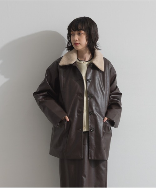 都会的ムードを纏う、ボア襟フェイクレザージャケット。 -material- ハリ感と落ち着いた光沢が魅力のフェイクレザーを使用。艶を抑えたマットな質感が上品な印象を与えつつ、無骨すぎない柔らかさも兼ね備えています。裏地付きでしっかりとした仕立ては防風性にも優れ、秋冬アウターとして安心感のある着用感に。リアルレザーのような高級感がありながら、お手入れも簡単で気負わずに使えるのもポイントです。 -design- ワークジャケットをベースに、衿元のボアがアクセントとなったクラシカル×モードなバランス感。ゆとりのあるオーバーサイズとドロップショルダーが、さっと羽織るだけでこなれた印象を演出します。身幅や袖まわりに余裕を持たせたシルエットは、厚手ニットの上からもストレスなくレイヤード可能。大きめのボタンや直線的なカッティングが無駄を削ぎ落としたデザインに映え、シンプルながら存在感のある一着に仕上がっています。