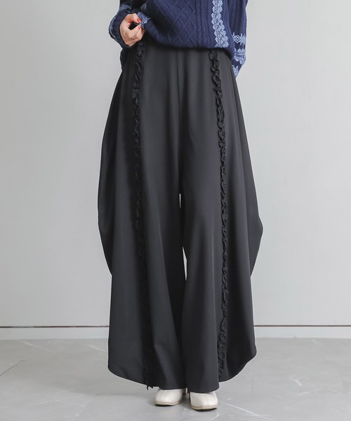 \選べる2サイズ/いつものコーデをアップデート!フリルラインサーキュラーパンツ「それ、どこの?」って聞かれた。フリルラインで魅せる唯一無二感。– Design – カーブラインになった円形シルエットのパンツ。中心にはフリルをあしらって女性らしいポイントをプラスしました。円形のシルエットでドレープ感がでてシルエットが特徴的な一着に。 – Styling –カジュアルにもキレイめにも合わせられる生地のパンツなので、ニットやスウェットからシャツ・ブラウスまで、幅広くコーディネートしていただけます。– Fabric –さらりとした肌触りのツイル生地を使用。程よい厚みでオールシーズンでご着用いただけます。– Size – 【1/2】着丈(総丈):95cm/101cmウエスト(上がり):64cm/76cmウエスト(最大):100cm/110cmヒップ(ベルト下~):200cm以上/200cm以上わたり幅:65cm/65cm前股上:45cm/47cm股下:57cm/59cm裾周り:50cm/52cm.......................................................................................somari imaginationロマンティックなテイストにカジュアルのエッセンスを加えた何でもない日常をときめきで満たすための服.......................................................................................