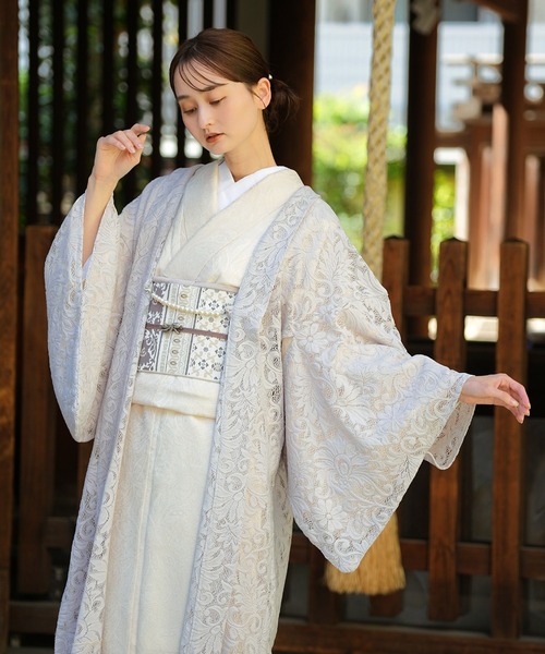 【内容】レース羽織 ※小物はイメージです やわらかく、さらりとした肌触りが特徴のミルパレースを使用したレース羽織。 モダンなボタニカルデザインで甘すぎず、上品なデザインに仕上がっています。 まだ少し肌寒い春や秋頃などにおすすめの羽織になります。 【サイズ】 身丈 約107cm 裄丈 約69cm 袖丈 約48cm ※レース生地は、非常にデリケートです。引っ掛かりに十分ご注意ください。 ※ご家庭で洗えますが、レースの形が崩れる可能性もございますので、できればドライクリーニング等をお勧めします。 ネットにたたんでいれたあと家庭用ドライクリーニング用洗剤などでやさしく洗ってください。干すときは陰干しで形を整え、平おきで乾かすのが理想です。 ※羽織紐は付いておりません。 ※商品画像はできる限り実物を再現するよう心掛けておりますが、お客様のモニターや閲覧環境によって大きく色味が異なる場合があります。 【ニコアンティーク レース羽織 アマイロ・クラシカ】 長羽織 羽織 着物 レディース 幾何学 花柄 グレージュ 薄グレー ミルパレース ボリュームレース 日本製 国産生地 塵除け フリーサイズ 和装コート アウター カジュアル お洒落 上品 エレガント 可愛い 春夏秋