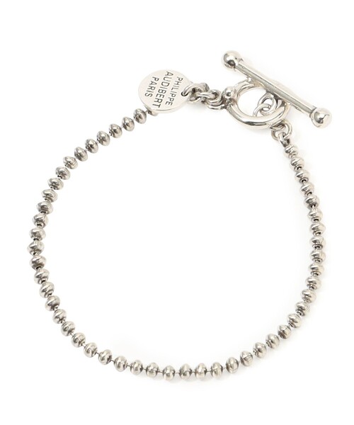 細かなボールチェーンが繊細な輝きを放つブレスレット。トグルデザインの留め具でアクセントに、ミニマムなデザインでスタイリングに合わせて自在にアレンジできます。単体はもちろん、他のブレスレットとのレイヤードでも美しく映えるアイテムです。※素材 ブラス、SLVメッキ〈PHILIPPE AUDIBERT(フィリップオーディベール)〉フランス・パリにて創業したジュエリーブランド。デザイナーで彫刻家でもあるフィリップ・オーディベールが、個性的な独立したアートと捉えたコレクションを展開しています。※商品の色味は、商品単体または素材アップ画像をご確認ください2026SS商品店舗にお問い合わせの際は、下記の商品番号をお申し付けください。商品番号:31-02-61-02003