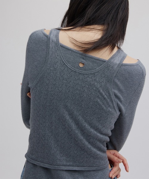 ハート柄のタンクトップがセットになったニットトップス。光沢感のあるビスコース糸を使用。タンクトップはハート柄の透かしアイレットで作成しました。インナートップは背中のハートくり抜きモチーフがさりげないポイントに。肌触りも良く、着心地も抜群。トレンドのレイヤードスタイリングが叶うアイテムです。単品使いでお手持ちのトップスなどと幅広いコーディネートを楽しんでいただけます。---------------------------------透け感:なし裏地:なし伸縮性:あり光沢感:なし生地の厚さ:普通お手入れ方法:手洗い可---------------------------------※ブランドロゴのリニューアル移行期間に伴い、モデル着用商品および商品単体画像とお届け予定の商品とで付属品のロゴデザインが異なる場合がございます。予めご了承ください。※商品画像はサンプルのため、色味やサイズ、素材の混率等の仕様に変更がある場合がございますので、予めご了承ください。※モデル着用写真につきましては、光や照明の加減により、実際よりも色味が異なって見える場合がございます。商品の色味は、商品単品の画像をご参考ください。また、使用しているパソコンのモニターやスマートフォン等の設定により、現物と画像の色味が若干異なる場合もございます。予めご了承ください。《 商品に関しまして 》(引っ掛け)この製品は、糸及び編組織の性質上引っ掛け・引っ掛かりやすい性質を持っております。着脱時には次の点に十分ご注意下さい。着用時にベルト・バッグ・アクセサリー・周囲の壁等、表面の粗い物との摩擦や、引っ掛かりにご注意下さい。水洗いや、クリーニングの際にもほかの物との引っ掛かりにご注意下さい。クリーニングの際は、取扱い表示記号をご確認の上お願い致します。(ピリング)ピリングとは繊維の表面が着用中に擦られたり、もまれたりする為、毛羽の小さなもつれが絡み合い、次第に大きくなってできた毛玉のことです。これは、素材の特性上着用の際避けられない現象で、その発生を完全に防止することはできません。ピリングにはお手入れが肝心です。気に入っているからといって、毎日同じ製品をお手入れなしで着続けますと、必ずピリングはできやすくなります。1日着用したら2日休ませる等ローテーションを考えて着用して下さい。ピリングができましたら引っ張って取ろうとせず、ブラッシングするか、小さなハサミで一つ一つ取り除いて下さい。(ニット製品)この製品は、十分に素材を選択し、製品化したものですが、デリケートな編地ですので、次の点にご注意下さい。着用の際、ボタン・ヘアピン・指輪指先等が編地に引っ掛からないようにご注意下さい。お召しにならない時は、ハンガーに掛けておかないで平らにして保管して下さい。