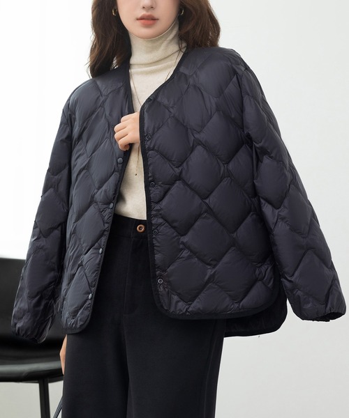 ■レディース ジャケット 驚くほどあったか 軽っふわ DOWN JACKET 収納袋付き あったかふんわり軽い着心地■SIZE:M/L/XL◆アイテムのお気に入り登録◆ハートマークをクリックしてお気に入り登録しておくと、本アイテムが“あなただけのタイムセール”候補になります!他にも本アイテムのプライスダウン情報・再入荷・ラスト1点などいち早くお得な通知を受け取ることができます!■驚くほど軽く暖かダウン90%・フェザー10%の贅沢比率で暖かさと軽さを両立保温性:熱を逃がさずしっかり保温通気性:4層構造で蒸れにくい軽量220g(Mサイズ)■軽くてコンパクトに畳めるのでかさばらない■水に強い生地で小雨でも安心■贅沢なダウン90%・フェザー10%使用■アウターの下にも着用しやすい表地:水に強い生地を採用し羽毛を清潔に保ちます裏地:裏地を二重にすることで羽毛の抜け落ちを防止し保温性もアップキレイめも大人かわいいもこなせるノーカラーダウンジャケットオシャレでベーシックなキルティングデザイン。カーブラインのパイピングで大人の女性らしい印象に仕上がります。オフィスカジュアルにぴったりなスラックスや、カジュアルなデニムやスカートにも合う万能アイテムです。Fabricなめらかマットな手触りでたっぷり空気を含んだふんわりとした質感デザイン性も機能性も充実Detail PointDetail 1首元すっきり見えするVネックすっきりVネックのノーカラーデザインでハイネックニットとも相性抜群!Detail 2ジャストで着られるセットインスリーブゆるっとせずにジャストなサイズ感で着られてキレイめな印象に。Detail 3留め外ししやすいスナップボタンシンプルなスナップボタンタイプでパチンと留め外しもしやすいのが◎Detail 4冷気をキュッとガード 袖口ゴム袖口はゴム入りのキュッと絞ったデザインで冷たい空気をガード!Detail 5軽やかな印象にサイドスリットサイドは抜け感をプラスできるラウンドカットのスリット入りDetail 6便利につかえるポケット付きside…2 inner…2両サイドと内側にポケット付き!深めなのでスマホなどを入れられるのが◎■収納袋付き畳むととってもコンパクト!SCENE通勤・通学や旅行、いつものお出かけに収納袋に入れてコンパクトに持ち運べる!* 収納時サイズ:約20×12cmBLACKMODEL size : XLweight : 約220gIVORYMODEL size : Lweight : 約210gKHAKI GRAYMODEL size : Mweight : 約200g161cm/45kgB:75/W:60/H:88【商品仕様】・重量 M:約200g L:約210g XL:約220g・生地の厚さ:厚手・透け感:なし・伸縮性:なし・裏地:なし【セット内容】・1点・アウター 付属品:収納袋◆ブランドのお気に入り追加◆セールやクーポン配布情報/新作アイテムの入荷/ショップニュースなどブランドの最新情報を受け取ることができます。Instagram > @day_closet1203 tiktok > @daycloset.official●サイズ表をご確認の上、お間違いのないようご購入下さい。※サイズは平置きで測定しております。 サイズは、実寸サイズを測っているため多少誤差がでる場合があります。 製造工程の関係上、各採寸箇所実寸(平置き)より【約-3cm~+3cm】程度は 誤差の許容範囲とさせて頂いておりますので、予めご了承くださいませ。●商品・着用者によっては多少の誤差がある場合がございます。●生地の取り方により、柄の位置等写真と異なる場合がございます。 ご了承ください。