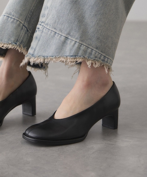 ◇26SS◇ ADAM ET ROPE' FEMME 【Material】 レザー調の質感にこだわって厳選したフェイクレザーを使用。 【Design】 モードな印象のある、美しいフォルムにとことんこだわったラウンドトゥパンプス。 ソールにフチを取り付けた構築的な底周りがポイント。 つま先はコロンとしたフォルムが目を引くラウンドトゥ+セットバッグヒールのシルエットが美しい、バランスの取れたデザイン。 アッパーのすっきりとしたカットラインで脚長効果が期待できるのも嬉しいポイント。 【Color】 ブラック、ベージュの2色展開。 【Styling point】 ワイドで長め丈のパンツからつま先を見せるスタイリングがおすすめ。 今っぽく取り入れるなら、カジュアルパンツと合わせてシューズのフォルムを際立たせるバランスもぜひ。