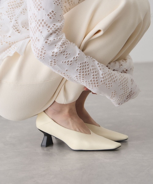 ◇26SS◇ ADAM ET ROPE' FEMME 【Material】 甲材、中敷き:合成皮革 底材:合成底 【Design】 長めのつま先とエッジの効いたカッティングが美しいフォルムが目を引く甲深パンプス。 どこから見ても上質で、美しい佇まいにこだわったデザイン。 接地面の広いヒールは安定感も良く、シルエットが美しい実用性も兼ね備えた1足。 【Color】 ブラック、オフホワイトの2色展開。 ソール、ヒールの色はブラック色統一。 【Styling point】 スタイルアップしつつ、程よい肌の抜け感で女性らしいスタイリングの外しアイテムとしてもおすすめ。 トレンドのボリューム感あるボトムスと好相性。