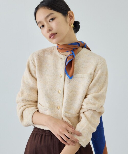 【デザイン・シルエット】 季節の変わり目に活躍するショート丈のクルーネックカーディガン。軽く羽織るだけでバランスよく決まるコンパクトなシルエットが魅力です。ふんわりモフモフとした柔らかい素材が特徴で、肌に触れたときの心地よさが抜群。軽量ながら暖かく、長時間着ても疲れない快適な着心地です。ジャケットの代わりとしても快適に着られ、通勤やお仕事にぴったりの1着です。 カラーは、ナチュラルで優しい印象のベージュと、春の訪れを感じるブルー×ホワイトの2色展開。ノーカラーで首まわりがすっきり見え、タートルネックやシャツブラウス、Tシャツとの相性も抜群。春先は軽羽織りとして、真冬は肌寒い日のワンマイル用やオフィスの冷房対策にも使える万能アイテムです。 【おすすめのスタイリング】 パンツはシルエットを選ばず◎ 特にロペ定番の美人スカート(ポケット付きタイトスカート)との合わせがおすすめです。 【素材】 柔らかくしなやかで、体にほどよくフィット。着たときに動きを妨げず、もたつかない軽やかな着心地です。手洗い可能で、ホームケア可能なのが嬉しいポイント。 ---------------------------- 透け感:なし 裏地:なし 伸縮性:あり 光沢感:なし 生地の厚さ:中肉 ポケット:あり 開き方:ボタン ---------------------------- 【モデル情報】 モデル身長:175cm 着用サイズ:F ※画像の商品はサンプルです。実際の商品と仕様、加工、サイズが異なる場合がございます。 ※撮影場所やライティング、お使いのモニター環境によって色の見え方が異なる場合がございます。 ※商品のカラーは画像の色味をご参照ください。動画は仕様説明のため、色味が実物と異なる場合がございます。