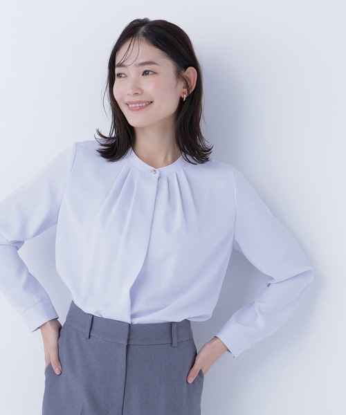<お仕事シーン・オフィスカジュアルにおすすめ> NBB定番人気アイテム!オフィスシーンにぴったりなベーシックで使いやすいキレイめブラウス。首元に入れたタックとキラリと光るゴールドカラー釦で、華やかなポイントを効かせたデザイン。ジャケットインをした時に首元のデザインが映えて上品に着ていただけます。 <素材> シワになりにくい合繊ジョーゼット素材を使用。上品なとろみ素材がキレイなシルエットを出してくれます。オフカラーでも透けにくい素材です。 <詳細> 仕様・前ボタン 裏地・なし 透け感・なし / 光沢・なし / 伸縮性・ややあり 生地の厚さ・普通 ※モデルの着用画像の場合、光の当たり具合により、実際の色味と異なって見えることがございます。色味は、商品単体の画像をご参照ください。 【ZOZOでのお買い物をもっと楽しむために!】 ■ブランド・ショップのお気に入り登録 ・いち早く新作アイテムや限定クーポンなどのお得な情報を受け取ることができます! ■商品のお気に入り登録 ・完売商品の再入荷通知や、残り1点の通知、各種セール通知も受け取ることができ、よりお得にお買い物頂けるチャンスがあります!