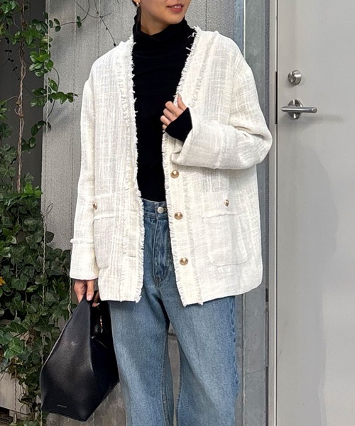 クラシックスタイルに欠かせないノーカラーツイードジャケット●きちんと感と華やかさを併せ持つノーカラージャケット。●カーディガン感覚で羽織れる、柔らかくくたっとした抜け感のある素材。●ヴィンテージ風のボタンなど細部までにこだわりを追求。●顔周りをすっきりと見せてくれるVネックライン。●ブラウス合わせはもちろん、デニムやTシャツで着崩すのも◎●オケージョンからデイリーまで、シーンレスで着回せる万能アイテム。■洗濯:手洗い可■透け感:若干あり(白のみ)■裏地:あり※画像の商品はサンプルです。実際の商品と仕様、加工などが若干異なる場合があります。また、生産過程上の都合により、洗濯表記や混率、サイズスペック等が多少変更になる可能性がございます。予めご了承ください。※トップの画像は、光の具合で色味が違って見える場合があります。◆気になる商品は「お気に入り」登録を◆ハートマークをクリックし、お好きなカラーを選んでお気に入りに登録すると入荷情報や残り1点の通知、完売カラーの再入荷、セール情報などを受け取ることができます。