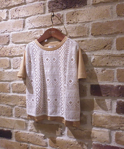 ◇レース使いがかわいいネイティブ柄Tシャツ シンプルなデザインのボディにレース使いがかわいいTシャツ 1枚でも存在のあるネイティブ柄で、秋らしくお使いいただけます。 デニムなどの 濃い目のカラーのスカートなどと相性のいい1枚です。