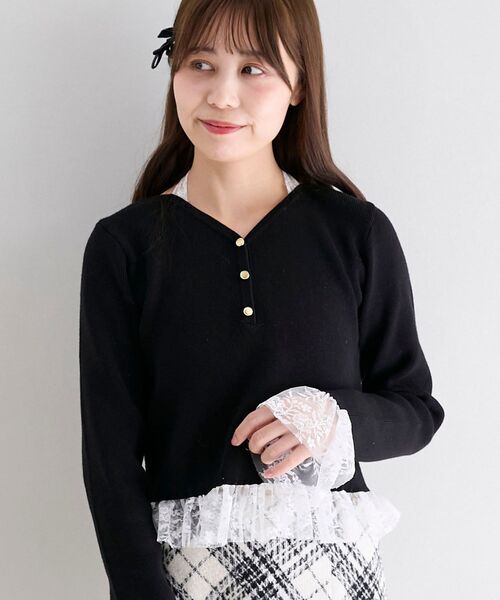 着るだけで大人っぽスタイルに♪上品に着映えするニットトップスが登場■デザインレースディテールがフェミニンな印象を与える上品ニット。デコルテがきれいに見えるVネックデザインにすることで大人っぽムードをプラス。裾にレースをドッキングし、シンプルながら映える一枚に仕上げました。襟ぐりのレースリボンはホルターネックとしても、前でリボン結びにしても◎様々なアレンジが可能です。■サイズ感ほどよく身体にフィットするサイズ感。伸縮性があるので着心地抜群です。※ネックポイントからの着丈:49cm■スタイリングお手持ちのボトムスと合わせるだけで、華のある上品コーデが完成する一枚。ミニボトムにロングブーツでフェミニンに、デニム合わせで大人カジュアルに。日常からお出かけまで使える万能ニットです。・・・・・・・・・・・・・・・・・・・・・・透け感:なし裏地:なし伸縮性:あり光沢感:なし生地の厚さ:普通・・・・・・・・・・・・・・・・・・・・・・■商品のお気に入り登録:再入荷通知やのこりわずか、お得なプライスダウンの情報も受け取ることができます。ぜひご登録ください◎※サンプルでの撮影の為、製品と仕様が異なる場合がございます。※商品の色味は、撮影場所や光のあたり具合などにより色味が違って見える場合がございます。また、お客様のお使いのモニター環境などにより色味が異なって見える場合がございます。予めご了承の上ご注文下さい。