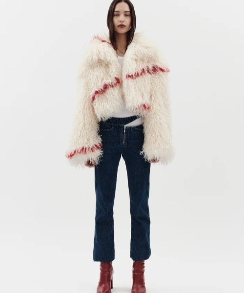 柔らかなモンゴルのフェイクファーを使用したSpun Jacktは大胆なオーバーサイズの襟が特徴です。ウエストはクロップド丈で、袖・胸・背中にはコントラストファーのトリミングがアシンメトリーに施されています。ジーンズとタンクトップに合わせるのがおすすめです。 【JAKKE(ジャッキー)】 ロンドンを拠点とし、2015 年にデビューしたジャッキー。ブランドコンセプトである ”動物保護” をモットーにエコファーを中心としたポップなアイテムを提案しています。