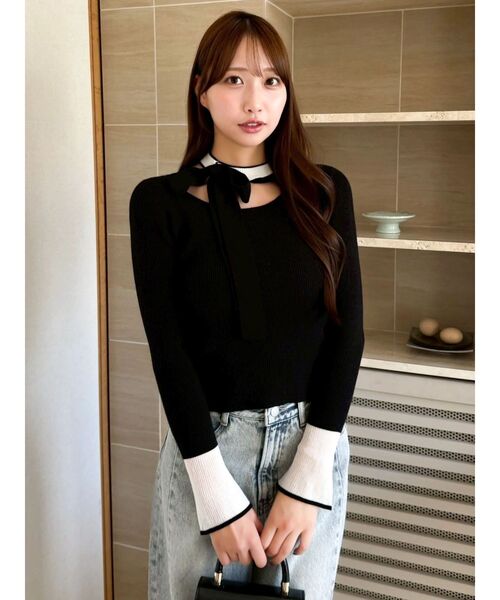 【商品】 襟とカフスに配色デザインを効かせたニットトップス。襟元には華やかなビッグリボンをあしらい、顔まわりを印象的に見せてくれます。袖口は透け感のあるシアー素材で切り替え、女性らしさをプラス。程よくフィットするリブ編みで、すっきり見えしながらも着心地は快適です。 【スタイリング】 ロングフレアスカートを合わせれば、上品でフェミニンな着こなしに。アウターはウールジャケットやロングコートで、上品で大人ポイコーディネートが完成します。 ※実際にお届けする商品と仕様やサイズが異なる場合がございます。また生産の都合上、お届け時期が前後する場合がございます。