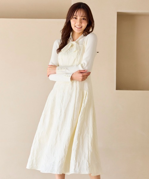 ジャガードが華やか見えするキャミワンピース ■デザイン繊細なチューリップ柄のジャガードが上品に映えるキャミワンピース。身体にほどよくフィットする美しい立体シルエットと、切替えからふんわり広がるフレアラインでスタイルアップ効果も抜群です。肩紐にはさりげないパールモチーフをあしらい、フェミニンなアクセントに。ストラップはお好みの長さに調整が可能です。華やかさと上品さを兼ね備えたデザインは、シーンを選ばず活躍。ホワイト系は柔らかく明るい印象に、ブラック系はシックで大人なムードを演出します。 着るだけで可憐さと洗練が共存する、Ferouxらしい特別な1枚です。 【Fabric】さりげない光沢と表情のあるチューリップ柄ジャガード素材。 軽やかなのにハリ感があり、立体的なシルエットを美しくキープします。季節を問わず長く着られるしなやかな素材感です。 【Styling】ボウタイやタートルのニットを合わせて上品に。 ブラウス合わせでセレモニーにも◎。 インナー次第で季節をまたいで楽しめる万能ワンピースです。 ※商品画像はサンプルを使用しているため、色味やサイズ等の仕様に変更がある場合がございますので、予めご了承ください。洗濯表示【本体のみ】40℃まで手洗い可 漂白不可 タンブル乾燥不可 日陰つり干し乾燥 アイロンは120℃まで 弱いドライクリーニング(石油系)可 弱いウェットクリーニング可