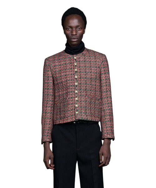 【2025-26 AUTUMN/WINTER】スリムフィットのクロップド丈ノーカラージャケット。フロントボタンは9個のメタル釦を採用。肩回りを共生地で切り替えた立体感のあるシルエット。ボディーにはMIXカラーのツイード素材を採用。他仕様・総裏・ノーベント・フロントパッチポケット 2箇所・内ポケット 2箇所・日本製