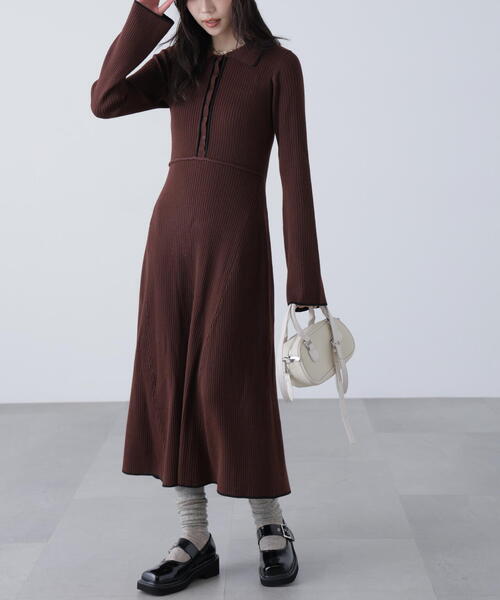トレンドのポロ襟がかわいいリブニットフレアワンピース。しっかとしたリブ編みながらも、柔らかな伸縮性があるので、体のラインをキレイに見せてくれます。脇は三角パネル入り、裾にかけて広がるフレアシルエットがレディライクな印象を叶えます。前身頃のウエストラインを高めにしてスタイルアップ見えに。襟元や前立て、裾の配色ラインがアクセントになり、一枚でコーディネートが完成します。ジャケットやブルゾン、コートを羽織ると、季節感のあるスタイルが楽しめます。足元はスニーカーでカジュアルに、ブーツと合わせてキレイめにまとめるのもおススメです。※モデルの着用画像の場合、光の当たり具合により、実際の色味と異なって見えることがございます。色味は、商品単体の画像をご参照ください。商品特性■透け感:なし■生地の厚さ:普通■裏地:なし■伸縮性:あり■光沢:なし■シルエット:スタンダード---------------------------------------------------◆商品のお気に入り登録◆お気に入りアイテムの値下げ・再入荷・在庫1点などの通知を受け取ることができます。◆ブランドのお気に入り登録◆新商品や再入荷、セール、クーポン配布などお得な情報を受け取ることができます。---------------------------------------------------