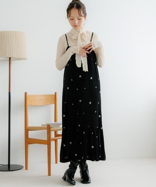 ■デザイン 光沢感のあるベロア生地にオリジナル刺繍を施した、 特別感たっぷりなワンピース♡ 華やかながら繊細でフェミニンな小花柄刺繡を 散りばめた冬にぴったりな一枚です。 ボディラインを拾いにくい、 落ち感のあるベロア素材で抜け感も◎ 裾に向かってゆったりと広がるフレアシルエットと ティアード裾がガーリーなポイントです。 シンプルですっきりとした胸元はエレガントすぎず、 組み合わせ次第でカジュアルな着こなしにも♪ デートや女子会など、特別なイベントにぴったりです。 【同生地のパンツもございます♪】 velour embroidery pants2 ■おすすめコーディネート sheer ribbon turtle2やwavy knit topのような シンプルなインナーとの合わせがおすすめです。 イベントの際はgorgeous lace cami2と合わせて、 カーディガンを羽織ったスタイリングが◎ ■flower/フラワー 「love&joy」をコンセプトに、商品に愛を込め、 お客様に楽しんでいただけるような、 ナチュラルでガーリーなアイテムを提案していきます。 【お買い物を上手にお楽しみいただくためのPOINT2つ】 ◎ 購入ボタン横の ♡ (ハートマーク)をクリック! 完売カラーの再入荷通知、残り1点の通知、 セールの通知を受け取れます。 (クリックまたはタップで商品のお気に入り登録♪) ◎ ショップのトップページにある ♡ (ハートマーク) 「お気に入りショップに追加」をクリック! 新商品や再入荷等、いち早くブランドの お得な情報を受け取れます。 (ブランドのお気に入り登録♪)