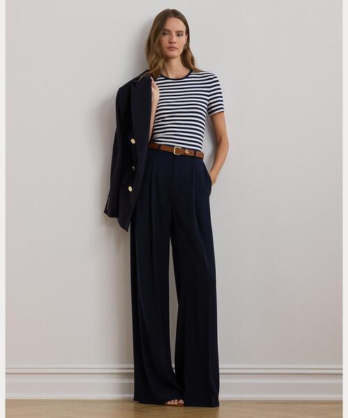 洗練されたルックを演出するラグジュアリーなダブルフェイスのジョーゼットを使用したワイドレッグパンツ。ワードローブに欠かせない定番テーラードアイテム。はっきりしたクリースラインとウエスト背面のダーツが、脚を長く見せるシルエットを引き立てるデザイン。・ハイライズ / ワイドレッグのシルエット / くるぶし下丈。・ベルトループ / ボタン留めジップフライ / 特別に開発した"Lauren Ralph Lauren"のロゴ入りコロゾボタン。・フロントウエストに斜めポケット2つ / ウエスト背面に箱ポケット2つ。・フロントウエストにプリーツ入り / 両脚の前後にクリースライン / ウエスト背面にダーツ / 総裏地。・リサイクルポリエステルを使用した商品。・モデル身長178cm、着用サイズ4※商品の色味は、光のあたり具合など諸条件により色感が多少異なって見える場合がございますので予めご了承下さい。