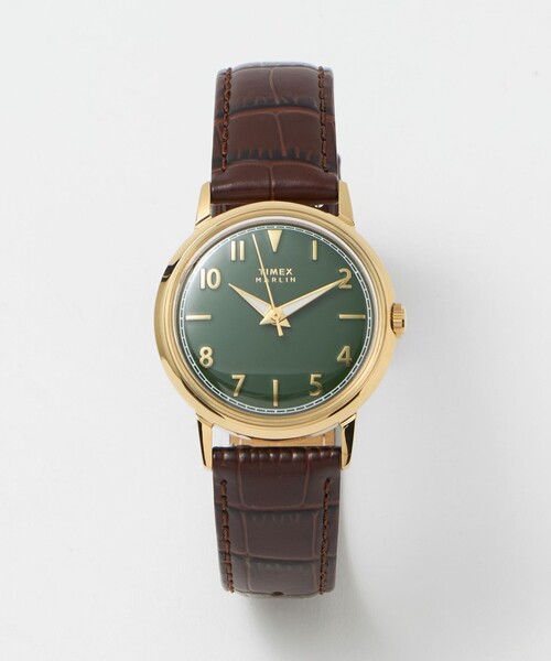 マーリン クォーツ■デザイン1950年代に誕生した名作「マーリン」をベースに、縁がカーブした凝った作りのボンベダイヤルや立体感のあるインデックスなど、当時のクラシックな魅力はそのままに、内部にクォーツを搭載したニューモデルが登場。オリジナルと同じ34mm径のケースは装着感が良く、男性でも女性でも手首に収まるサイズ感は視覚的にも◎。細く品のあるシェイプのラグやドーム型のアクリル風防などとあわせ、トラッドにもカジュアルにも幅広いスタイルにマッチするタイムレスなデザインです。■メーカー品番・BLACK:tw2y37600・DK.BROWN:tw2y37700・その他1:tw2y37800・その他1カラーは、バンド/ブラウン、ケース/ゴールド、ダイアル/グリーンのカラーです。■機能性・クォーツ・30m防水<TIMEX(タイメックス)>TIMEXは1854年、アメリカ・コネチカット州ウォーターベリーで設立され、長年にわたり高品質で信頼性の高い時計を提供してきました。革新性と耐久性を兼ね備え、手ごろな価格でスタイリッシュなデザインの時計を展開。幅広いライフスタイルに対応し、人々の日常生活に寄り添うブランドです。【注意事項】※商品に「取り扱い上の注意書き」、「洗濯表示」がございます場合は、使用前に必ずご確認ください。※商品画像は、光の当たり具合やパソコンなどの閲覧環境により、実際の色味と異なって見える場合がございます。あらかじめご了承ください。※商品の色味の目安は、商品単体の画像をご参照ください。※こちらの商品は、一部のWEB店舗限定となっております。お問い合わせの際は、ユナイテッドアローズ カスタマーサービスデスクまで下記の品名/品番をお申し付け下さい。品名:SC★★TIMEX Marlin 34mm 品番:32434000000