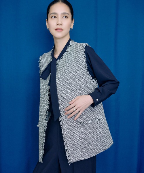 セレモニーやお仕事などきちんとしたシーンにも、デニム合わせ休日のお出かけシーンにおすすめのツイードジレ【デザイン・シルエット】 ツイード素材のノーカラーのジレベスト。フリンジディテールが華やかで、きれいめにもカジュアルにも使えるアイテム。さりげなくあしらったくるみボタンが上品なアクセントに。普段使いにも合わせやすい1着です。 【おすすめのスタイリング】 ダブルクロスシリーズのパンツできれいめスタイルからカジュアルなスタイリングも可能なアイテムです。きれいめなボウタイブラウスからタイプライターの華やかなブラウスまで合わせやすく、様々な着こなしを楽しめます。 【素材】 さりげなくラメが入った高級感のあるツイード素材で、別注素材になります。 しっかりと厚みがあるツイードですが、きれいめ過ぎない素材感なので、セレモニーから普段使いまで様々なシーンで着用できます。 ---------------------------- 透け感:なし 裏地:あり 伸縮性:なし 光沢感:なし 生地の厚さ:厚手 ポケット:あり 開き方:ボタン ---------------------------- 【モデル情報】 モデル身長:175cm 着用サイズ:38 Atsukoさん身長:175cm 着用サイズ:38 【2026 Spring/Summer Ceremony シリーズ】 セットアップやアンサンブルでご着用いただけます。 ・トリアセテートダブルクロス素材シリーズ クルーネックジャケット(品番:GGV26030) Vネックジャケット(品番:GGV26020) ペプラムブラウス(品番:GGGH26080) テーパードパンツ(品番:GGS26070) ワイドストレートパンツ(品番:GGS26080) タイトスカート(品番:GGC26060) フレアワンピース(品番:GGE26000) ・ツイードシリーズ ノーカラージャケット(品番:GGV26040) ジレ(品番:GGJ26040) ・セレモニー向けアイテム ボウタイブラウス(品番:GGH26090) ジョーゼットシフォンプリーツワンピース(品番:GGE26030) 【着用シーン】 学校行事:セレモニー*、入園式*、卒園式*、入学式*、卒業式*、説明会、学校行事*、授業参観日*、受験 冠婚葬祭:フォーマル*、同窓会*、食事会*、発表会*、顔合わせ*、ご挨拶*、七五三*、お宮参り* ビジネス:オフィス*、お仕事*、通勤*、入社式、面接、面談 *がおすすめの着用シーンです。 おすすめの着用シーンだけではなく、ロペのセレモニーシリーズはセレモニーはもちろん、フォーマル・オフィスといった、幅広いシーンで着用できるようになっております。 また、単品でもコーディネートがしやすく、シーンに合わせて様々なインナーと合わせられる、シンプルで着回しができるデザインです。 新生活や一生に一度の大切なハレの日を、ROPE'のセットアップシリーズでお迎えください。 ※画像の商品はサンプルです。実際の商品と仕様、加工、サイズが異なる場合がございます。 ※撮影場所やライティング、お使いのモニター環境によって色の見え方が異なる場合がございます。 ※商品のカラーは画像の色味をご参照ください。動画は仕様説明のため、色味が実物と異なる場合がございます。