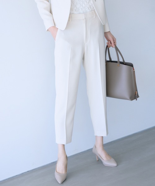 美脚シルエットが叶うテーパードパンツ。上品さと快適さを兼ね備えた万能アイテム【デザイン・シルエット】センタープレス入りですっきり見えるテーパードパンツです。ストレッチ素材でベルト脇にゴムが入っているので、ラクな着心地で着用できます。ラインがシャープに見える美しいシルエットで、セレモニーやママ向けのシーン、お仕事・通勤などいろいろな場面で着回せるアイテムです。同素材でジャケット、テーパードパンツ、ワイドパンツ、タイトスカート、ブラウスも揃っており、セットでも単品でも自由にコーディネートできるのも魅力です。【おすすめのスタイリング】同素材のジャケットやペプラムブラウスと合わせればたセットアップスタイルが完成します。セレモニーのツイードジャケットやボウタイブラウスと合わせれば、きれいめなスタイリングに。お仕事用としても活躍するパンツです。【素材】トリアセテートの平二重組織でドライタッチ、膨らみ、落ち感が際立つ素材に仕上がっています。糸特性でもある発色性の良さが、深みのある色を出し、高級感のある雰囲気を演出してくれます。----------------------------透け感:ベージュ(27)は少しあり裏地:ベージュ(27)はあり、ネイビー(40)はなし伸縮性:ややあり光沢感:なし生地の厚さ:中肉ポケット:あり開き方:ファスナー洗濯:手洗い可能----------------------------【モデル情報】モデル身長:175cm 着用サイズ:38Atsukoさん身長:175cm 着用サイズ:38【2026 Spring/Summer Ceremony シリーズ】セットアップやアンサンブルでご着用いただけます。・トリアセテートダブルクロス素材シリーズクルーネックジャケット(品番:GGV26030)Vネックジャケット(品番:GGV26020)ペプラムブラウス(品番:GGGH26080)テーパードパンツ(品番:GGS26070)ワイドストレートパンツ(品番:GGS26080)タイトスカート(品番:GGC26060)フレアワンピース(品番:GGE26000)・ツイードシリーズノーカラージャケット(品番:GGV26040)ジレ(品番:GGJ26040)・セレモニー向けアイテムボウタイブラウス(品番:GGH26090)ジョーゼットシフォンプリーツワンピース(品番:GGE26030)【着用シーン】学校行事:セレモニー*、入園式*、卒園式*、入学式*、卒業式*、説明会、学校行事*、授業参観日*、受験冠婚葬祭:フォーマル*、同窓会*、食事会*、発表会*、顔合わせ*、ご挨拶*、七五三*、お宮参り*ビジネス:オフィス*、お仕事*、通勤*、入社式、面接、面談*がおすすめの着用シーンです。おすすめの着用シーンだけではなく、ロペのセレモニーシリーズはセレモニーはもちろん、フォーマル・オフィスといった、幅広いシーンで着用できるようになっております。また、単品でもコーディネートがしやすく、シーンに合わせて様々なインナーと合わせられる、シンプルで着回しができるデザインです。新生活や一生に一度の大切なハレの日を、ROPE'のセットアップシリーズでお迎えください。※画像の商品はサンプルです。実際の商品と仕様、加工、サイズが異なる場合がございます。※撮影場所やライティング、お使いのモニター環境によって色の見え方が異なる場合がございます。※商品のカラーは画像の色味をご参照ください。動画は仕様説明のため、色味が実物と異なる場合がございます。