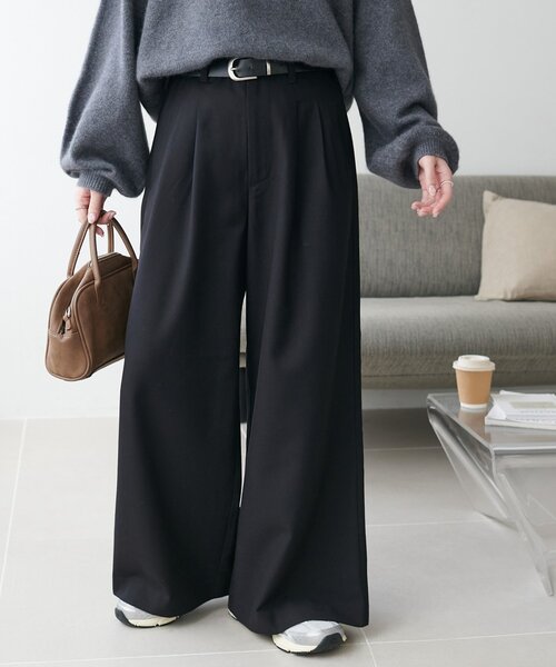 どんなアイテムでも相性のいい大人のための洗練されたワイドパンツ・広がりすぎない、程よくゆとりのあるワイドシルエット・ウエストはバックがゴムでストレスフリーな履き心地!・フロントのタックは、さり気なく腰回りをカバー〇・オフィスでも馴染むシンプルなデザイン・滑らかな肌さわりが特徴の素材・春、秋は一枚で、真冬はタイツ合わせがおすすめです。●スタイリング・ハイゲージニットやコンパクトなトップスを合わせるとメリハリのあるコーデに!・タカーディガンを合わせたシンプルキレイメコーデはお仕事にもおすすめ〇・スウェットを合わせたこなれ感のある大人カジュアルコーデも楽しみます。●おすすめスタイリングアイテム▶リブ袖口ボタンタートル《WEB限定カラーあり▶前後2WAYフェザーヤーンショートベスト▶フェザーヤーンクルーカーディガン《WEB限定カラーあり》▶【ユニセックス】Verticalロゴスウェット***********************洗濯方法:洗濯機洗い(弱)裏地:なし透け感:なし伸縮性:ややあり光沢感:なし生地の厚さ:普通***********************●STAFF着用コメント149cmスタッフ(Sサイズ):長めの丈感なので、ハイウエストで着ます。ワイドシルエットでスラッと見えるのが嬉しい〇あえてペタンコの靴合わせで、ゆるっと感のあるコーデにしたいです。155cmスタッフ(Mサイズ):ブーツと合わせたかったので、Mサイズにしました!腰回りに余裕があるので、しゃがんだ時のヒップラインも拾いにくく安心〇キレイメでも合わせられるので、お仕事にも着まわせます。162cmスタッフ(Lサイズ):スニーカーでもブーツでも合わせらるサイズです。デニムではないので、ワイドパンツでもカジュアルになりすぎない!●シリーズもございます。▶ウールブレンドショートパンツ【お取り扱いの注意】※着用時、洗濯時は必ず取り扱い表示・タグをご確認の上、お取り扱いください。・洗濯機洗い(弱):30℃まで可能(裏返してネットに入れて洗濯してください。)・長時間水に浸けておいたり、濡れたままにしないでください。・濃色製品は、色移りすることがありますので、他の物と分けて洗濯してください。・蛍光増白剤入り洗剤を使用しないでください。・漂白:不可・タンブル乾燥:不可・アイロン:低温120℃まで(アイロンの際は、当て布をしてください。)・ドライクリーニング:可能・ウエットクリーニング:可能・素材の特性上、洗濯やドライクリーニングにより若干縮みます。・この製品は、生地の特性上、強い力が加わると部分的に裂けることがありますので、お取り扱いには十分ご注意ください。【カラー表記について】システム上の都合により、一部カラー名がサイト表記と異なる場合がございます。【入荷時期について】入荷日ごとに販売数量が決まっているため、オンラインでは完売後に次期納期の数量にて予約販売を行っております。店舗入荷時期と予約商品のお届け時期が異なる場合がございますので、予めご了承ください。※追加入荷のある商品もございますので、詳しい店舗入荷時期に関しましてはお近くの店舗へお問い合わせください。※店舗の在庫状況に関しましては、こちらのページに記載されている「店舗在庫」から確認にしていただけます。「在庫あり」の表記でも、お取り置き分などでお客様に販売できない場合がございます。※予約商品でも、店舗では追加がない場合もございます。ご了承ください。※初回予約商品でも配送処理が発生するため、店舗より遅れてのお届けとなる場合がございます。