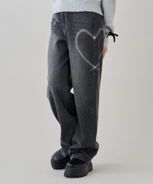 ハート型の抜染プリントが魅力的なデニムパンツです。 シルエットがきれいに見えるよう、ウエストを細めに設計しています。 アジャスターゴム入りでフィット感も魅力。 どんなトップスとも相性良く決まり、デイリー使いに重宝します。 【透け感】透けない 【生地の厚さ】普通 【伸縮性】なし 【裏地】なし 【ポケット】あり 【アジャスター】あり