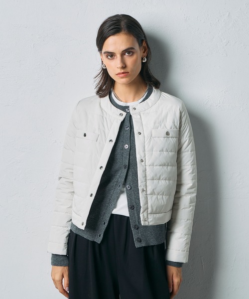 軽くて暖かい、機能中綿ショートコート太陽光等の光エネルギーを吸収、熱エネルギーに変換することで暖かくなり、蓄熱保温する高機能中綿を採用した、軽くて暖かいショートキルトコート。程よい光沢感が上品な印象を与え、襟のないクリーンなシルエットが洗練されたスタイルを演出します。ドットボタンがさりげないアクセントとなり、前を閉じてトップスライクに着こなすのもおすすめ。パネルラインがすっきりとした女性らしい印象を引き立てる、機能性と美しさを兼ね備えた一枚です。【機能】光吸収発熱・蓄熱保温--------------------------透け感:なし裏地: あり伸縮性:なし光沢感:ややあり生地の厚さ:厚手 --------------------------【モデルスペック】身長:175㎝、着用サイズ:F※照明などの関係により、実際と色味が違って見える場合がございます。予めご了承ください。商品の色味は、商品単品画像をご参照下さい。