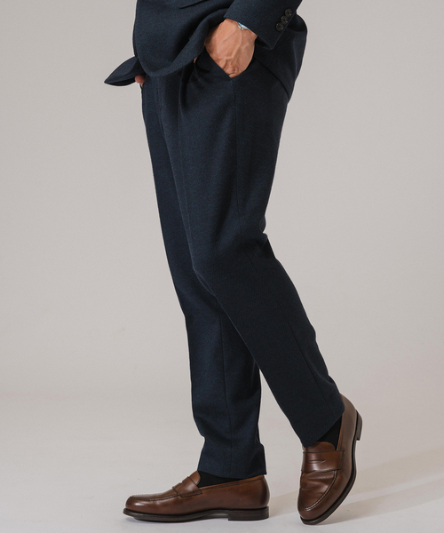 VMID:1019683393 杢感(メランジ)が色の深みを出しているジャージ素材を使用し、柔らかく、動きやすいのにきちんと見える定番人気のイージースラックス。 細身のテーパードのが効いた品のあるすっきりとしたシルエットでカジュアルにもきれいめにも合わせていただけます。バック部分のみゴム仕様になっておりますのでリラックスして着用していただけます。 また、コットン/ウール素材なので、コットンのソフトな風合いとウールのウォーム感を併せ持ち、生地の表面はクリアな品のあるのが特徴です。 そして、マイナーチェンジを施しており、ヒザ幅と裾幅を若干広めに取ったことで着用感がアップしています。 同素材のアイテムと組み合わせてセットアップでの着用もお楽しみいただけますので、単品での使用はもちろんの事、セットアップスタイルもぜひお試しくださませ。 品番:26010300101010 商品名:コットン/ウール ジャージー 2ボタン ジャケット【セットアップ着用可】 ※カラーによって組成、混率が異なります。ご注意下さいませ。 ブラックA(002)、ブラウンB(022), ネイビー(040) 組成:表地 毛38%, ポリエステル34%, 綿28% 裏地 ポリエステル100% グレー(006)、ネイビーA(041) 組成:表地 ポリエステル36%, 毛34%, 綿30% 裏地 ポリエステル100% ********************** 透け感:なし 裏地:なし 伸縮性:あり 光沢感:なし 生地の厚さ:普通 ********************** 【スタッフ着用コメント】 《スタッフA》 身長:179cm/体重:64kg/普段サイズ:L/着用サイズ:L サイズ感:ボディラインに沿うようなサイズ感 素材感:風合いと温かみを感じる表面感 着心地:細身ながらストレッチが効いており快適な着用感です。大きい動作などでも動きを妨げられません ********************** 【ご注意】 ※照明の関係により、実際よりも色味が違って見える場合があります。 またパソコン・スマートフォンなどの環境により、若干製品と画像のカラーが異なる場合もございます。 ※商品の色味は、商品アップ画像をご参照ください。 本体:ドライクリーニング