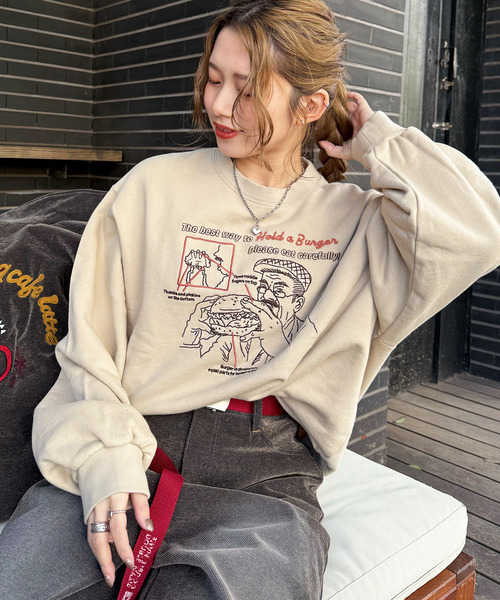 【ユニセックス着用可◎】 VINTAGE感のある“手描きグラフィック刺しゅう”が主役のプルオーバー! 渋いおじいちゃんが、ハンバーガーの上手な持ち方をレクチャーしてくれているという、なんともクセになるデザイン。 目の前のハンバーガーに夢中な、絶妙な表情にも注目です◎ 刺しゅうの世界観に合わせた“渋めカラー”に、レタス・ベーコン・バンズなど、ハンバーガーをイメージした配色をそれぞれに落とし込んだこだわり仕様。 ユニセックスで着られるゆるさがありつつ、スタイリングの主役になる一枚です! インナーにメローやシャーリングブラウスを重ねて、デニムと合わせるカジュアルコーデが相性抜群♪ 甘めアイテムのはずしにも使えて、ランダムヘムチェックSKやバルーンスカートとのミックススタイルもおすすめです◎ ■ポイント ・ダブルネーム ・恐竜 ・ミニレックス ・DOUBLE NAME ・恐竜界隈 ・刺繍 ■素材 ・透け感:なし ・裏地:なし ・光沢感:なし ※生地寄りの画像が実際の色味と近いものとなります。 ※ご覧のモニター環境や撮影環境により実際のカラーと異なる場合がございますので 画像をご参照の上、ご了承頂けますようお願い致します。