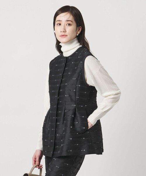 構築的な美シルエットと華やぎを纏う、洗練ベスト ■デザイン ウエストで切替を施し、上半身はすっきりと、裾にかけて緩やかに広がるシルエットが女性らしさを引き立てるベスト。 フロントを開けた際に輝きを添えるメタルの隠しドットがアクセント。 ■素材 光沢感のある厚地のポリエステルサテンベースに、ウーリー糸でリボンのように表現したカットジャガード。 立体感のある表情と、手仕事ならではの価値がポイント。 ユナイテッドアローズのオリジナル素材です。 ■コーディネート フィットシルエットのニットやデザインブラウスをインナーに合わせれば、洗練されたレイヤードスタイルに。 同素材のパンツとセットアップでの着用もおすすめです。 ・同素材のブラウスもご用意がございます。対象品番:15212990002 ・同素材のパンツもご用意がございます。対象品番:15142990015 ・同素材のコートもご用意がございます。対象品番:15252990001 ============================ 裏地:あり 透け感:なし 伸縮:なし 光沢感:ややあり ケア方法:ドライクリーニング ============================ 【注意事項】 ※商品に「取り扱い上の注意書き」、「洗濯表示」がございます場合は、使用前に必ずご確認ください。 ※商品画像は、光の当たり具合やパソコンなどの閲覧環境により、実際の色味と異なって見える場合がございます。あらかじめご了承ください。 ※商品の色味の目安は、商品単体の画像をご参照ください。 店舗へお問い合わせの際は、全国のUNITED ARROWS各店舗まで下記の品名/品番をお申し付けください。 品名:UBCMD RBN CUT JQ VEST 品番:15222990003