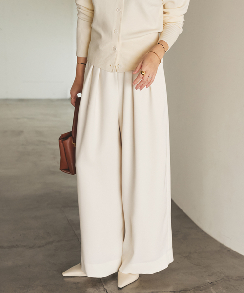 ◆履きやすく、リラックスムード漂う“washable Flare パンツ”が今シーズンも登場!さらりと軽やかに広がる、上品な印象のワイドパンツ。絶妙な太さのセミワイドシルエットがリラックスムードを演出してれる一着。ウエストにはゴムを使用しており、ストレスフリーな穿き心地も魅力。落ち感があり、程よい艶がある事でシャツやTシャツなどラフなアイテムも女性らしく着こなせます。これからの季節に、一つあると幅広く活躍してくれる万能なアイテムです。※ホワイトのみ透け感がある為、裏地を付けています。その他の裏地なしのカラーに比べてオフのウエストをやや大きめに調節し仕上げております。**********************透け感:なし裏地:ホワイトのみあり伸縮性:ややあり光沢感:なし生地の厚さ:普通**********************※旧品番24030922717010・24030922729040の追加品番です。※取り扱いについては、商品についている品質表示でご確認ください。※ 店頭及び屋内外での撮影画像は、光の当たり具合で色味が違って見える場合があります。商品の色味は、商品アップ画像をご参照ください。また、お客様のお使いのPCのモニター環境などにより色味が違って見える場合があります。予めご了承の上ご注文ください。本体:手洗い可能