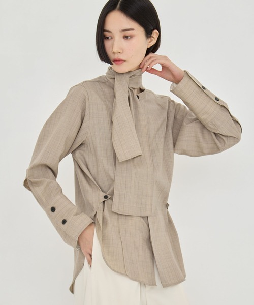 〈デザイン〉・コンパクトなジャストサイズのシャツ・衿のボウタイは取り外し可能で前後逆にしてスタンドカラー風にする着こなしもおすすめ・ウエストをボタンでシェイプすることが可能・メンズライクな雰囲気を楽しめるライトグレーと、ブラウントーンに合わせやすいベージュ×レッドのストライプの2色展開〈素材〉・尾州産地で生産された上質なジャパニーズウールを使用・適度なハリ感のあるマニッシュな梳毛ウール・薄くてとても軽いため通年着用可能裏地:あり透け感:なし伸縮性:なし厚さ:普通洗濯:ドライクリーニング推奨STUDIOUS/ステュディオスEDGY DAY-WEAR -エッジの効いたデイウェア-溢れ出るエナジーを纏えるエッジの効いたデイウェアブランド。テーラリングを軸に、パンツスーチングやそれらを再解釈したスカート、ドレスなどを展開。パーソナルを引き立たせるミニマルなスタイルから、時代を駆け抜ける前衛的なスタイルまで自由自在に。インスタグラムアカウント(@studious_______)のアンダーバー7本には"毎日のベースとなる服"という意味を込めた。モードベーシックブランド "STUDIOUS" は 〈セレクトショップSTUDIOUS〉 で手に入る。----------------------------------------------------【お買い物をよりお楽しみいただく為に】▼商品のお気に入り登録をおすすめします!♡をクリックしてください。完売カラーの再入荷や、ラスト1点の通知、セールの際の通知を受ける事ができます。ブランドのお気に入り登録もご一緒にお願い致します。
