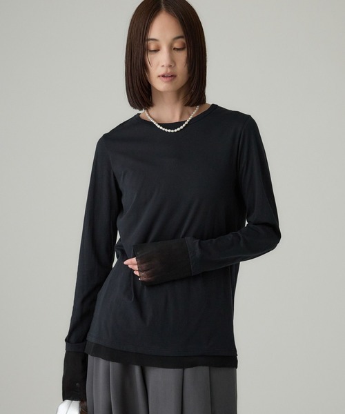 2025 WINTER COLLECTION こなれたレイヤードスタイルが叶う、チュールドッキングT ーーー ◆DETAILポイント◆ ・袖口や裾にチュールを重ね着したかのように見えるロンTEE。 ・詰まり過ぎず、あき過ぎない、絶妙な襟ぐりのあき。 ・袖丈はあえて長めに設定しており、袖口でくしゅくしゅとさせて着るのがおすすめ。 ◆FABRICポイント◆ 身頃 ・インド産最高級超長綿の天竺。 ・上品で美しい生地表面。 ・繊細な風合い、しっとりした肌触りが特徴。 チュール ・ラメ入りシアーチュール。 ・繊細なラメ感が大人っぽい印象に。 ーーー ◆おすすめコーディネート◆ ・ニットやジャケットを重ね着して、袖口や裾からのレイヤードを楽しんで。 ・一枚着としても活躍する、汎用性の高い一枚。 【BABYLONE / バビロン】 "Be myself" 好きな色 好きなかたち 好きな着こなし 自分の好きは自分だけが知ってる 自分らしい自分を好きでいたい 時代のニュアンスを取り入れながらも まわりにとらわれない ブレないしなやかな女性たちへ 【気になる商品は「お気に入り」登録を】 ハートマークをクリックし、お好きなカラーを選んでお気に入りに登録すると 在庫残り僅かの通知、再入荷通知などの情報を受け取ることができます。 ※商品の取り扱い方法につきましては、タグ等に記載されている「取り扱い上の注意」「洗濯表示」をご確認ください。 ※屋外での撮影画像は、光の当たり具合で色味が違って見える場合があります。あらかじめご了承ください。なお商品の色味は、スタジオ撮影の画像をご参照ください。