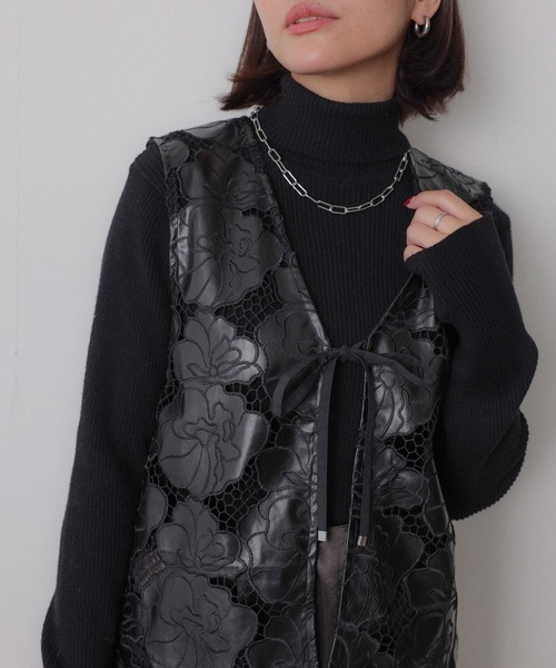 【Floran 合皮刺繍レースベスト】 \合皮で描く存在感/ 大胆なフラワーモチーフをつないだレースベイスト ■Styling 合皮をしっかり存在感のある花の形にかたどりそのフラワーパーツを糸でレース状に連結したデザインベストが登場しました。 花モチーフは小花ではなく、ひとつひとつがしっかりと目を惹く大きさ。 合皮の艶感、質感がはっきりと見え、まるでアクセサリーのようにコーデの主役になる一枚◎ 重厚感のある素材×透けの抜け感のバランスが絶妙でシンプルなコーデに華やかさをプラスしてくれます。 ロンTやハイネックに重ねて簡単レイヤード。 スウェットに合わせて甘辛ミックスな大人カジュアルもおすすめ。 ワンピースに重ねて特別感のあるスタイリングやシャツと合わせればレースの影が映えてよりモードにしてくれます。 レイヤードに新しい表情をプラスしてくれる一枚です。 ■Detail 合皮で大きめの花モチーフを形作ったインパクトあるデザイン。 花パーツをポリエステル糸でつないだレース状構造。 透け感があるので重たくならずレイヤードでもバランスがとりやすい。 合皮のフレームが際立ちコーデに立体感をプラス◎ 軽量でストレスのない着用感。 ■Material 花モチーフを綺麗に保つハリのある素材。 レース糸は丈夫で繊細な糸で安心。 ▽生地感 透け感:あり ●〇〇〇〇 なし 生地の厚さ:厚い 〇〇〇●〇 薄い 裏地:なし 伸縮性:なし ※この素材は摩擦(特に湿った状態での摩擦)や、汗や雨などでぬれた時は他の衣料や下着・バッグなどに色が移る場合がありますので、ご注意下さい。 ※繊細な素材を使用している為、引っ掛かりには十分お気をつけください。 ※洗濯の際は、他の物と一緒に洗わないでください。 ※濡れた状態で他の洗濯物を重ね合わさないでください。 ※漂白剤および漂白剤入りの洗剤のご使用はお避け下さい。 ※水洗いやクリーニングの際は、クリーニングネットを使用ください。また、つけおき洗いはお避けください。 ※商品の梱包には細心の注意を払っていますが、通販の特性上、到着時に畳みシワがついている可能性がございます。予めご了承ください。 ※詳しいお手入れ方法は商品タグをご参照ください。 【Information】 ◆《お気に入り登録》がオススメ◆ ・「商品のお気に入り登録」で再入荷通知や、ラストの通知、セール通知も受け取ることが出来ます。 ・「ブランドのお気に入り登録」で新商品や再入荷など、お得な情報を受け取ることが出来ます ※撮影時のライティング、太陽光、ご覧になっているモニター・PC環境により、実際の商品と色味が異なって見える場合がございます。予めご了承をお願い致します。